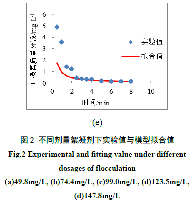 圖2表示在不同PAC劑量下實(shí)驗(yàn)值和擬合值比較。從圖中可看出,采用二級(jí)動(dòng)力學(xué)模型描述PAC絮凝小球藻是合適的,特別是在絮凝劑劑量小于100mg/L時(shí),實(shí)驗(yàn)實(shí)測(cè)數(shù)據(jù)與擬合曲線吻合。在PAC劑量為123.5mg/L和147.8mg/L時(shí),絮凝時(shí)間小于2min時(shí),實(shí)驗(yàn)實(shí)測(cè)數(shù)據(jù)和擬合值有一定的偏差,這可能是在絮凝初期,礬花顆粒較小,沉降速度較慢,同時(shí)取樣位置液面下2cm處,造成實(shí)驗(yàn)值偏高,當(dāng)沉降時(shí)間大于2min時(shí),礬花顆粒增大,沉降速度增大,實(shí)驗(yàn)值與擬合值較為吻合。