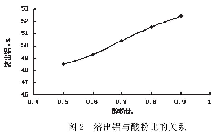 在酸液和反應(yīng)溫度和時(shí)間不變的情況下改變酸粉比例,研究酸粉比與鋁酸鈣粉溶出鋁的關(guān)系。如圖2。