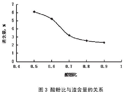 由圖3看出隨著酸粉比的升高,渣含量也逐步降低。因?yàn)樗崃枯^多可以溶解比較多的難溶物,這樣就可以減少?gòu)U渣的排放,減少?gòu)U渣的二次污染。