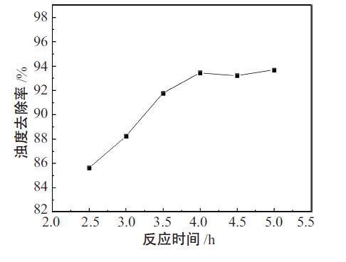 由圖5可以看出,隨著反應(yīng)時間的延長,濁度去除率逐漸增大,產(chǎn)品的絮凝效果顯著提高,反應(yīng)時間為4h時,濁度去除率達到較大,再繼續(xù)延長反應(yīng)時間,濁度去除率變化不大。這主要是因為,反應(yīng)時間過短,反應(yīng)體系不能吸收足夠的熱量進行水解反應(yīng),進而影響聚合反應(yīng),導致產(chǎn)品的聚合度不高。隨著反應(yīng)時間增加,越有利于聚合反應(yīng)的順利進行,產(chǎn)品的鹽基度增大,濁度去除率上升。反應(yīng)時間過長,對產(chǎn)品鹽基度增加的貢獻不大,同時浪費大量資源,影響生產(chǎn)周期。較后確定較佳反應(yīng)時間為4h。